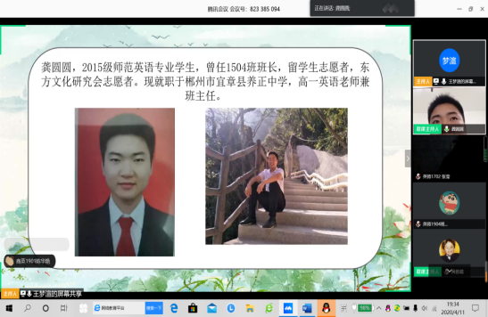 本网讯(通讯员 沈叶恒)“齐心抗‘疫’,停课不停学”。菁菁学子讲坛第四十五期“毕业老腊肉细数血泪教训,教你如何走出大学雷区”于4月11日晚在腾讯会议App线上展开。15级商务英语专业优秀毕业学子黄雅晴(现就职于蓝山县人民检察院)和15级师范英语专业优秀毕业学子龚圆圆(现就职于郴州市宜章县养正中学)应邀参与此次活动。各班级250多名同学主动报名参加。