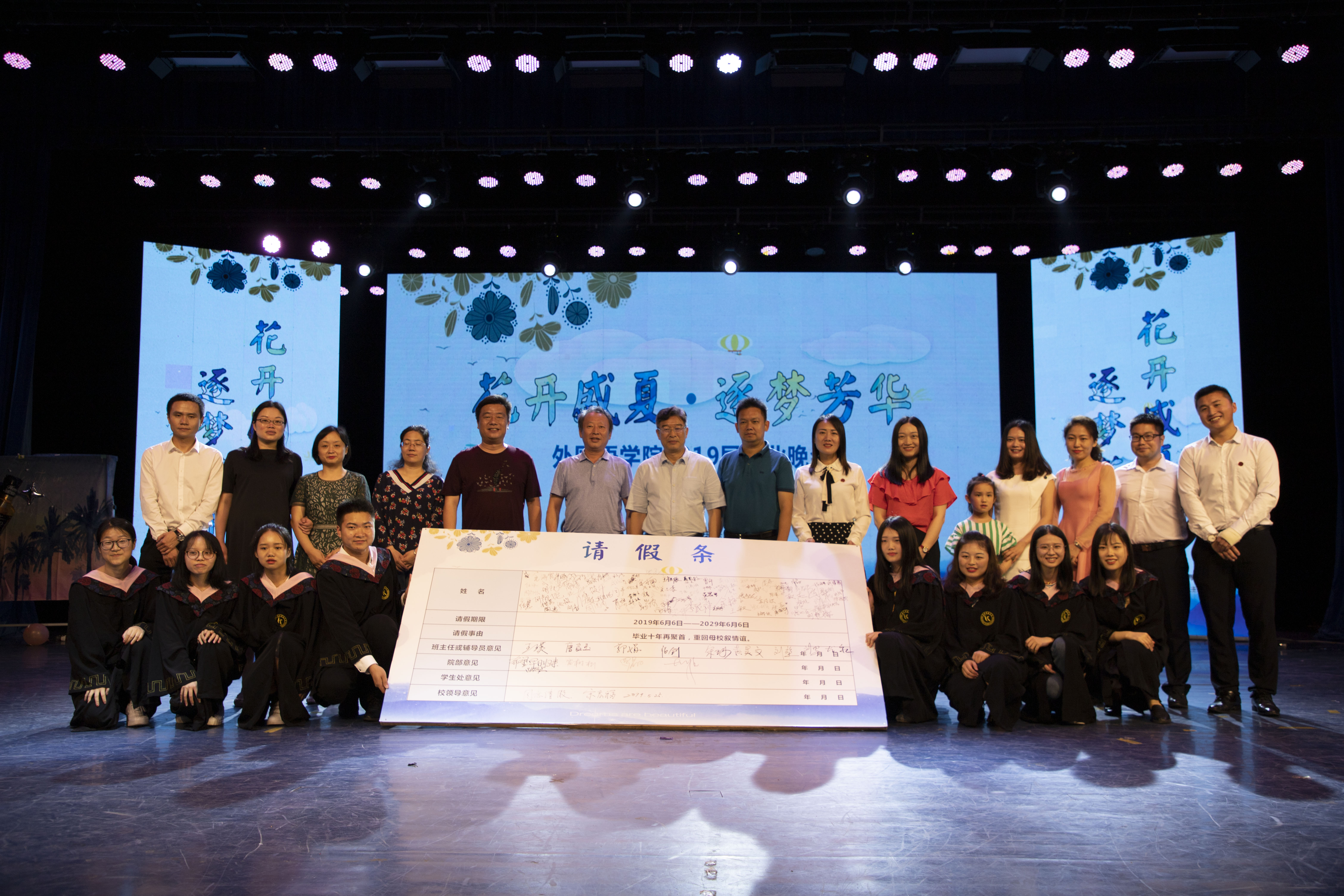 本网讯(通讯员 杜俊杰 张露)5月25日,外国语学院“花开盛夏,逐梦芳华”2019届毕业晚会在我校音乐厅隆重举行。校党委委员、副校长宋宏福到场观看晚会并为毕业生签批“请假条”。