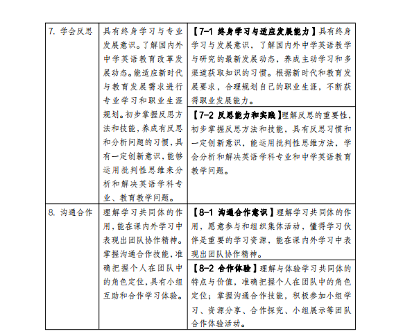 掌握英语学科发展和中学英语课程改革发展动态,能在自身专业发展 和中学英语教育教学实践中不断反思,改进教学,养成终身学习的习惯。 具有良好的团队合作精神和沟通协调能力,具备成长为中学英语教育卓越 教师的素养。