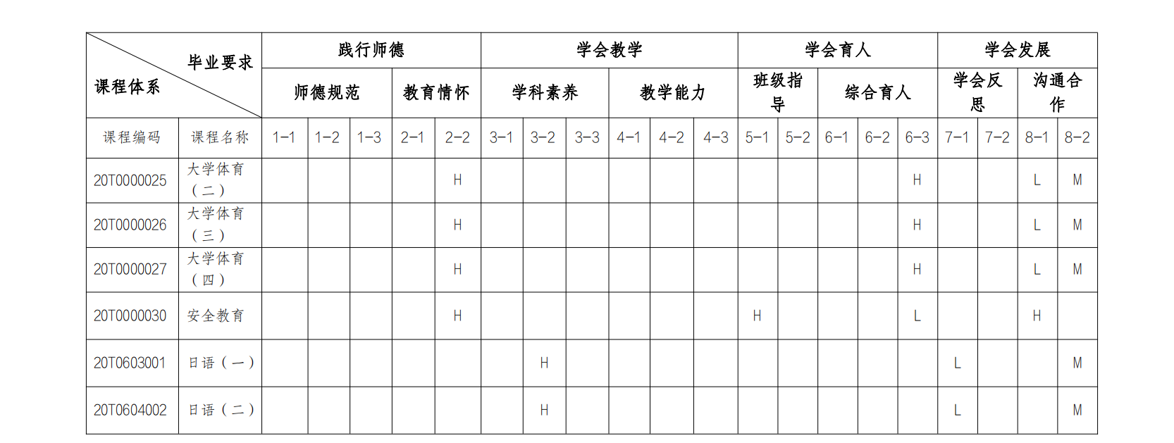 注:根据毕业要求与课程目标、课程内容与课程目标的对应关系编制本表,“课程体系支撑毕业要求实现关系矩阵”应覆盖所有 必修环节,开设各课程(理论课程、实践课程)应对毕业要求达成具有一定支撑作用。根据课程对各项毕业要求的支撑强度分别用“H (高)、M(中)、L(弱)”表示,支撑强度的含义是:该课程覆盖毕业要求指标点的多寡,H 至少覆盖 80%,M 至少覆盖 50%,L 至 少覆盖 30%。不必全部支撑,不可能全部支撑,须明确高支撑。