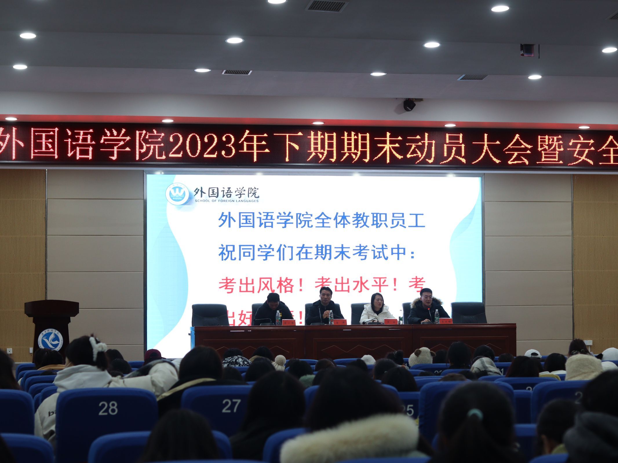 2023年12月19日下午,外国语学院在潇湘大讲堂召开2023年下期期末动员大会暨安全教育会。外国语学院党总支书记唐君、副书记罗晶以及学工办主任陈小峰出席会议,会议由团总支书记李政锴主持。