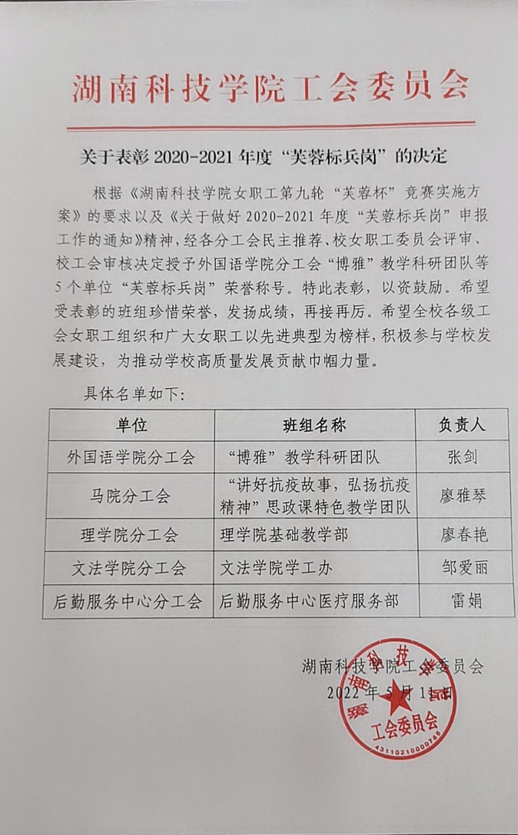 九游在线关于表彰2020-2021年度“芙蓉标兵岗”的决定
