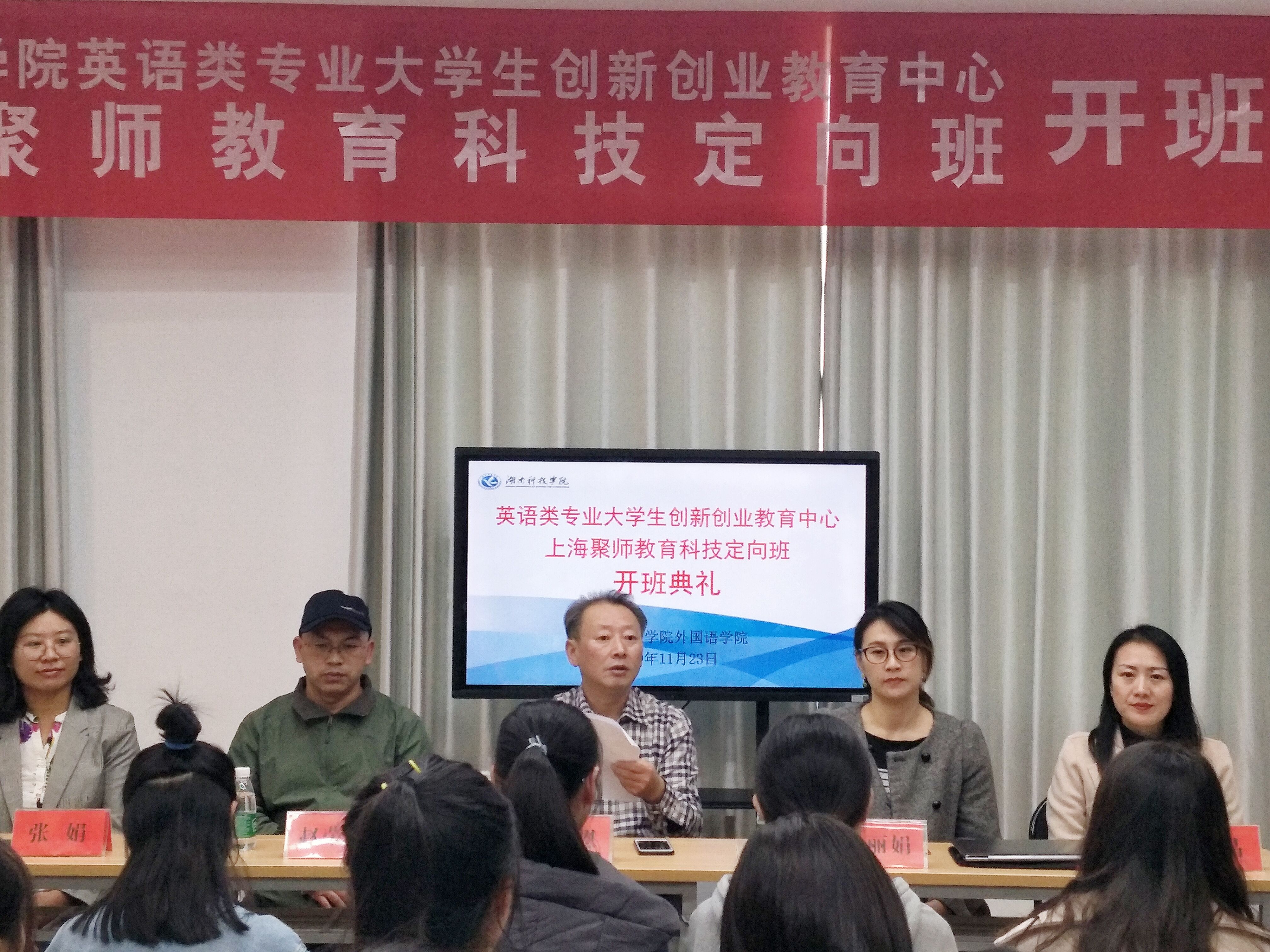本网讯(通讯员:王梦渲)11月23日下午,九游在线英语类专业大学生创新创业教育中心上海聚师教育科技定向班开班典礼在学校创新创业大楼317“聚师堂”校企合作工作室举行。出席本次活动的有上海聚师教育科技有限公司联合创始人谢丽娟、上海聚师教育科技有限公司培训经理张娟、外国语学院院长欧华恩教授和就业创业指导中心副主任赵荣。开班典礼由外国语学院党总支副书记罗晶主持,上海聚师教育科技定向班第一期42名学员共同参加此次开班典礼。