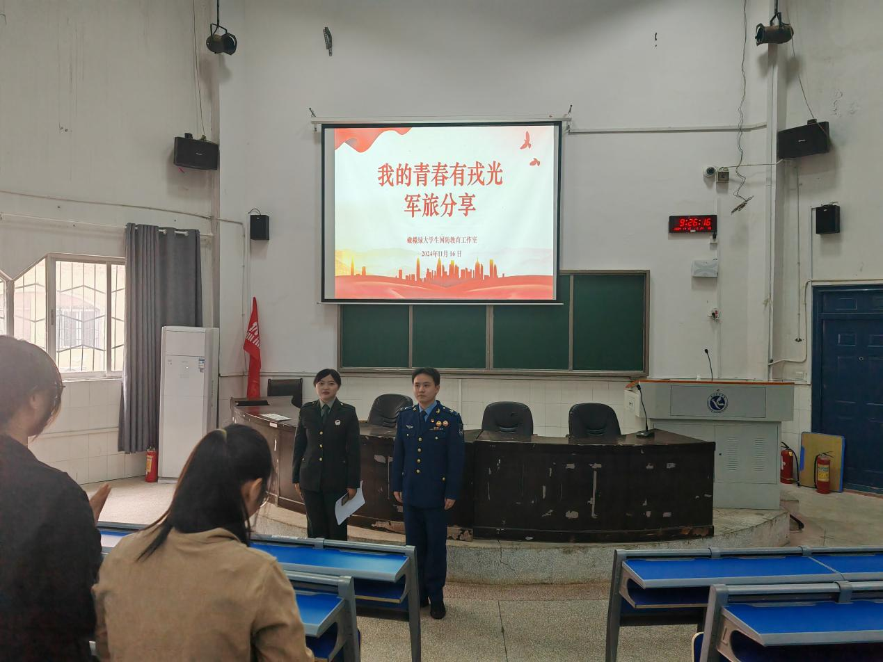 11月16日,文法学院开展“我的青春有戎光”征兵宣讲活动,本次活动邀请文法学院退伍大学生士兵杨新花、倪振宇同学在宣讲会上进行军旅事迹分享,全体大一新生参加,文法学院团总支书记张健主持本次活动。
