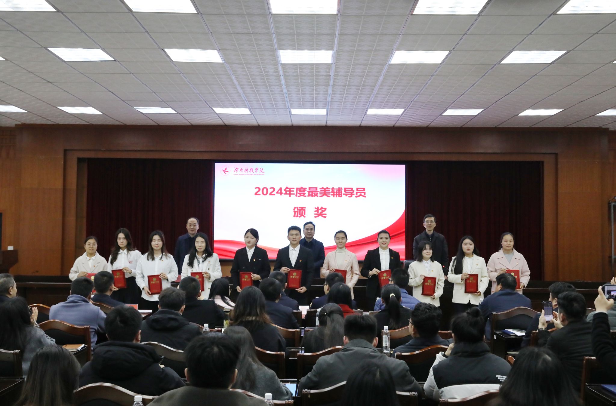 陈灿军宣读了表彰文件,校领导分别为2024年度在学生工作方面表现突出的11位辅导员颁发荣誉证书。