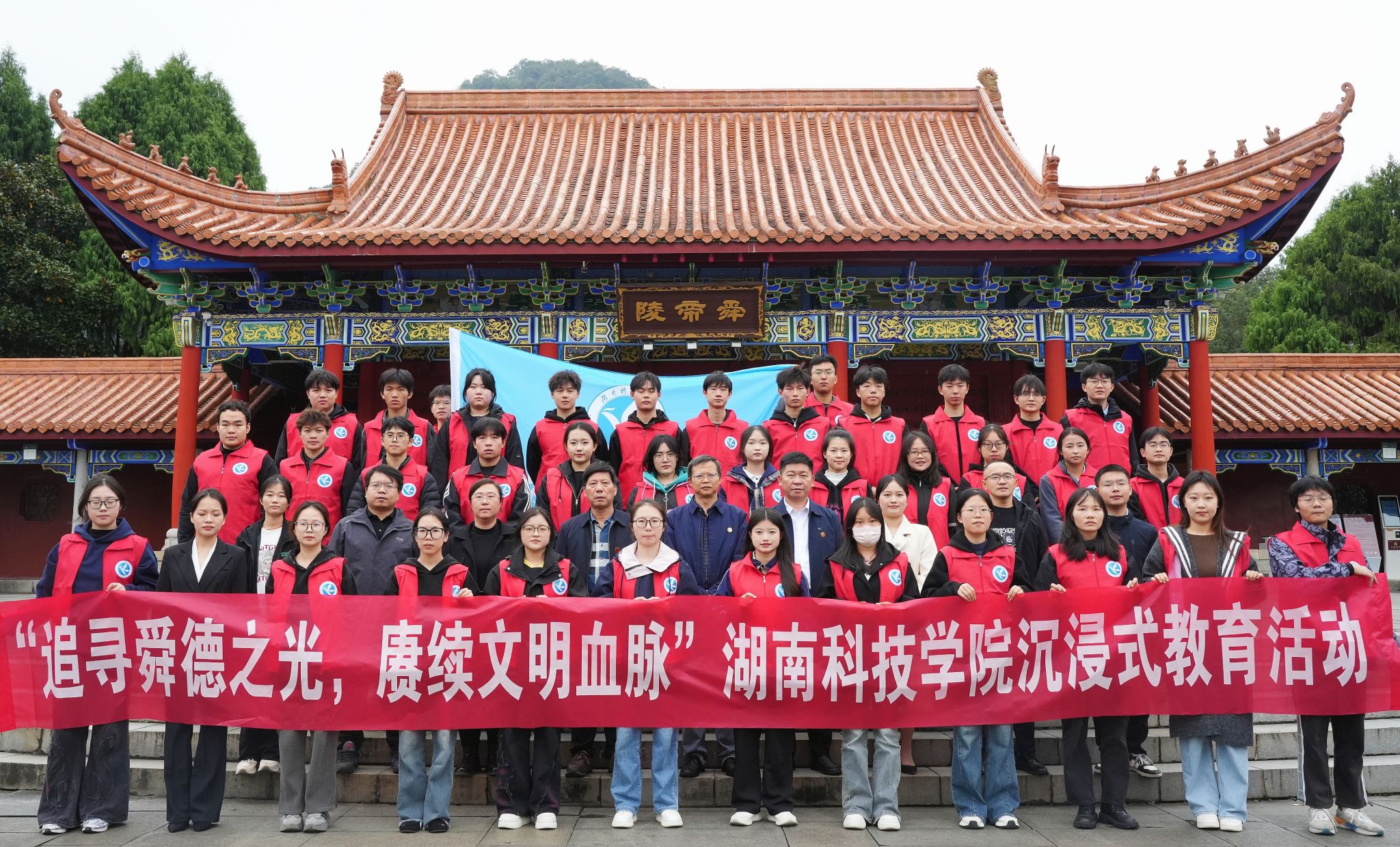 本网讯(记者 谷利梅 摄影 吴伊娜)当历史典籍碰上实地走访,当古代先贤对话当代青年,思政教育应该如何打破边界、“破圈”育人?近日,我校30余名舜德学子代表奔赴永州市宁远县舜帝陵,开展了一堂沉浸式“移动思政课”,通过实地探访感悟舜德精神,筑牢文化自信。