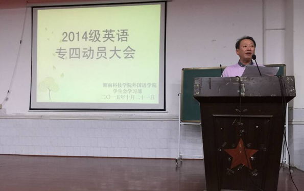 本网讯(通讯员 伍泳 夏湘怡) 为了更好的迎接全国高校英语专业四级考试,10月21日晚外国语学院大二学生在博雅楼东三召开2014级英语专业四级动员大会。该院院长欧华恩出席动员大会并作重要发言,14级辅导员陈小峰主持会议, 大三学生代表王冬方、刘鑫现场传授备考经验,为大二同学答疑解惑。