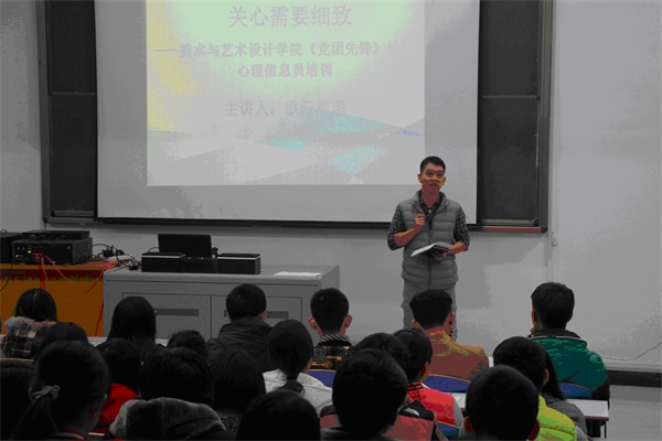(通讯员 王伍燕)2015年11月11日,美术与艺术设计学院“党团先锋”论坛系列活动—心理信息员培训在美术楼102顺利开展,培训围绕着“关爱学生心理健康,注重培养心理信息员”这一主题展开,由该院学工办主任欧阳智超老师主讲,该学院分团委学生会、各班班委会干部、各寝室长参加了此次培训。