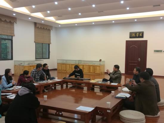 在国学院小成堂,院长张京华教授首先对国学院的基本情况以及教学模式、教学和研究成果等作了介绍。国学院开办一年,已成功开设了独具特色的教学体系,涵盖文、史、哲基础与经、史、子、集核心,以及琴、茶、书、画、汉服缝制、传拓等实践课程,形成了浓厚的传统文化氛围。一年以来,学生撰写学术论文并公开发表的共计22篇;发表学术随笔、古籍点校的共计23篇;作为正式代表参加学术会议5次等,取得了可喜的成绩。