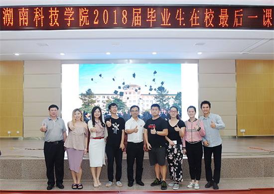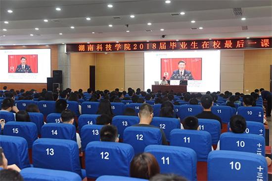 讲课开始,全场合唱校歌《潇湘之歌》,荡气回肠,整装待发的同学们激情飞扬。陈弘从“习近平总书记对青年的希望”、“青年一代面临的历史机遇”、“人生之路要不断储备思想的力量”、“德才兼备修身 自强不息奋斗”四个方面,表达了对毕业生的殷切期盼与嘱咐。他强调说,保持初心才是真正的坚守,超越自我才是真正的卓越。希望大家为梦而坚定,将个人理想融入中国梦中,在中华民族伟大复兴中国梦的大海里搏击巨浪,扬帆远行。