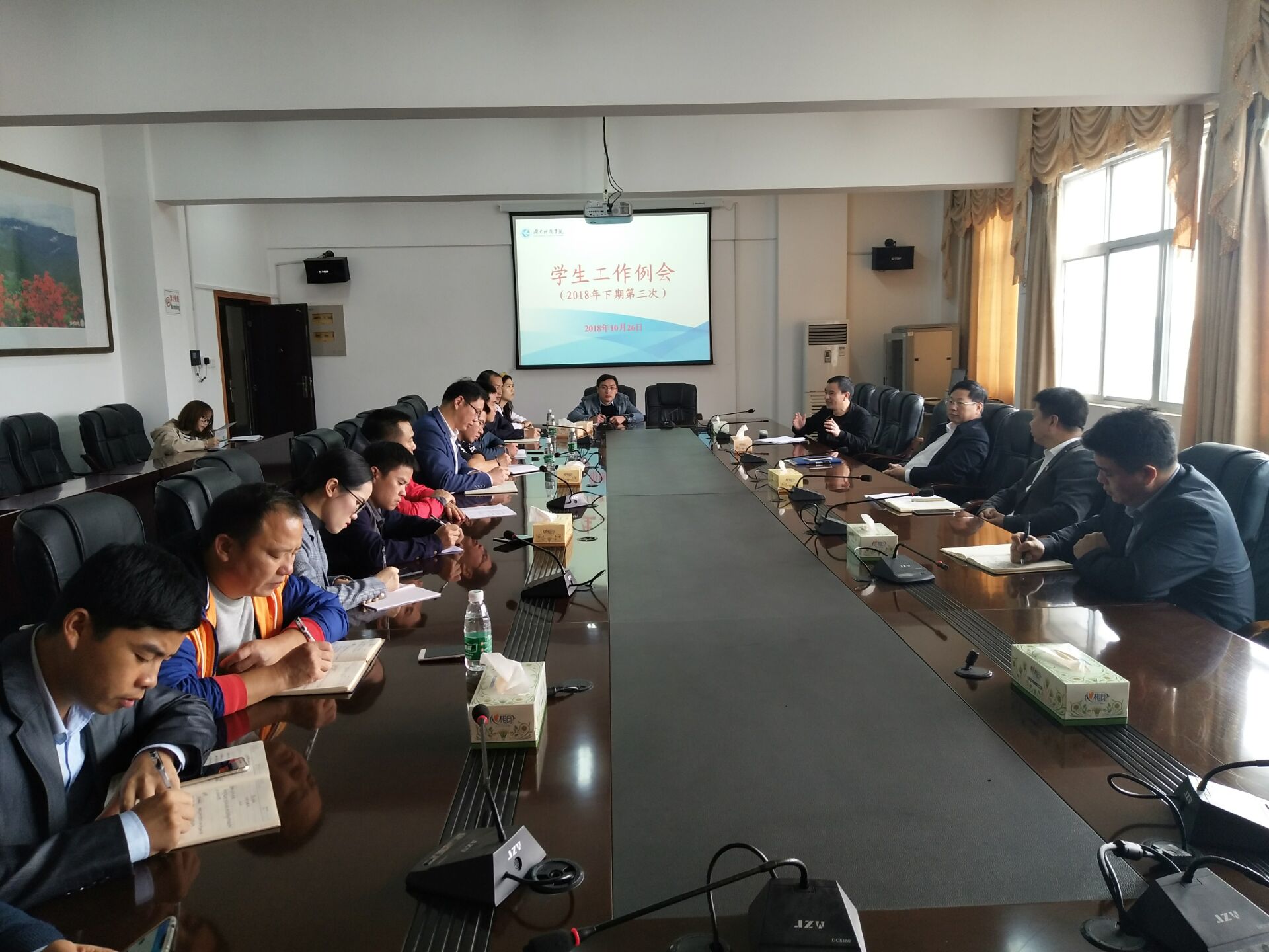 (简讯)10月26日上午9点30分,学工部组织召开了2018年下期第三次学生工作例会,会议由学工部长唐华山主持,副校长程智开、教务处副处长雷腾、各教学学院党总支副书记以及学工部相关人员参加了会议。