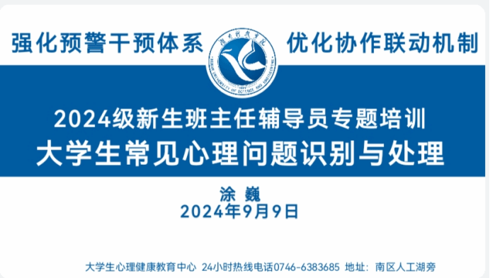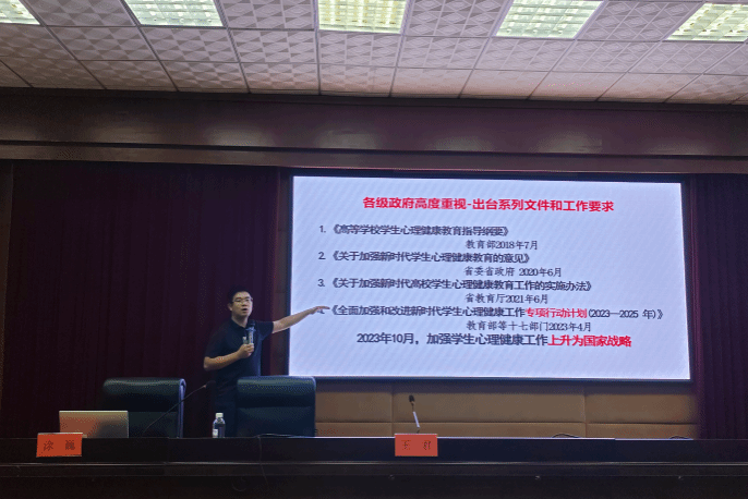 随后,大学生心理健康教育中心主任涂巍做大学生常见心理问题识别与处理专题辅导,涂巍以大学生心理健康现状导入,深入分析了大学生常见的心理问题,并结合实际案例详细阐述了这些心理问题的表现形式和识别方法;强调早发现、早干预的重要性,新生入学是心理问题高发时期,辅导员、班主任要熟知危机干预流程和心理工作方式方法。