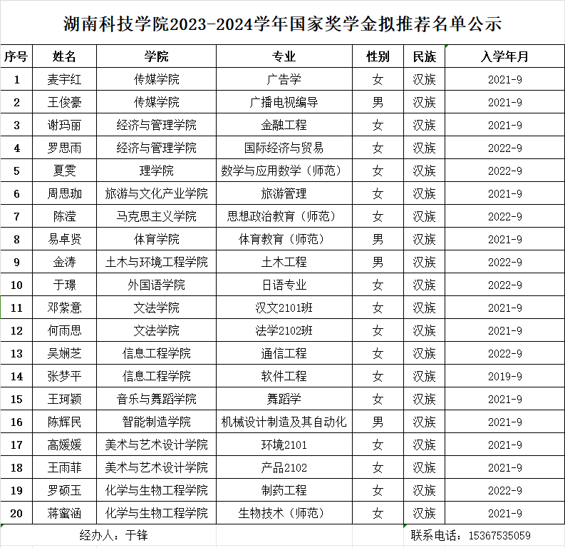 根据湖南省教育厅等5部门关于印发《湖南省学生资助资金管理办法》的通知(湘财教〔2022〕13号)、湖南省学生资助管理中心《关于做好2024年普通高校国家奖助学金评审工作的通知》(湘学助〔2024〕30号)文件要求和《九游在线学生奖励办法》、《九游在线学生资助管理办法》、《九游在线国家奖学金、国家励志奖学金、国家助学金管理办法》有关规定,学工部于2024年9月25日召开资助专干会议,安排部署评奖工作。经学生个人申请,各学院初审、公示,学工部审核。拟推荐化学与生物工程学院蒋蜜涵等20名同学参评2023-2024学年国家奖学金。