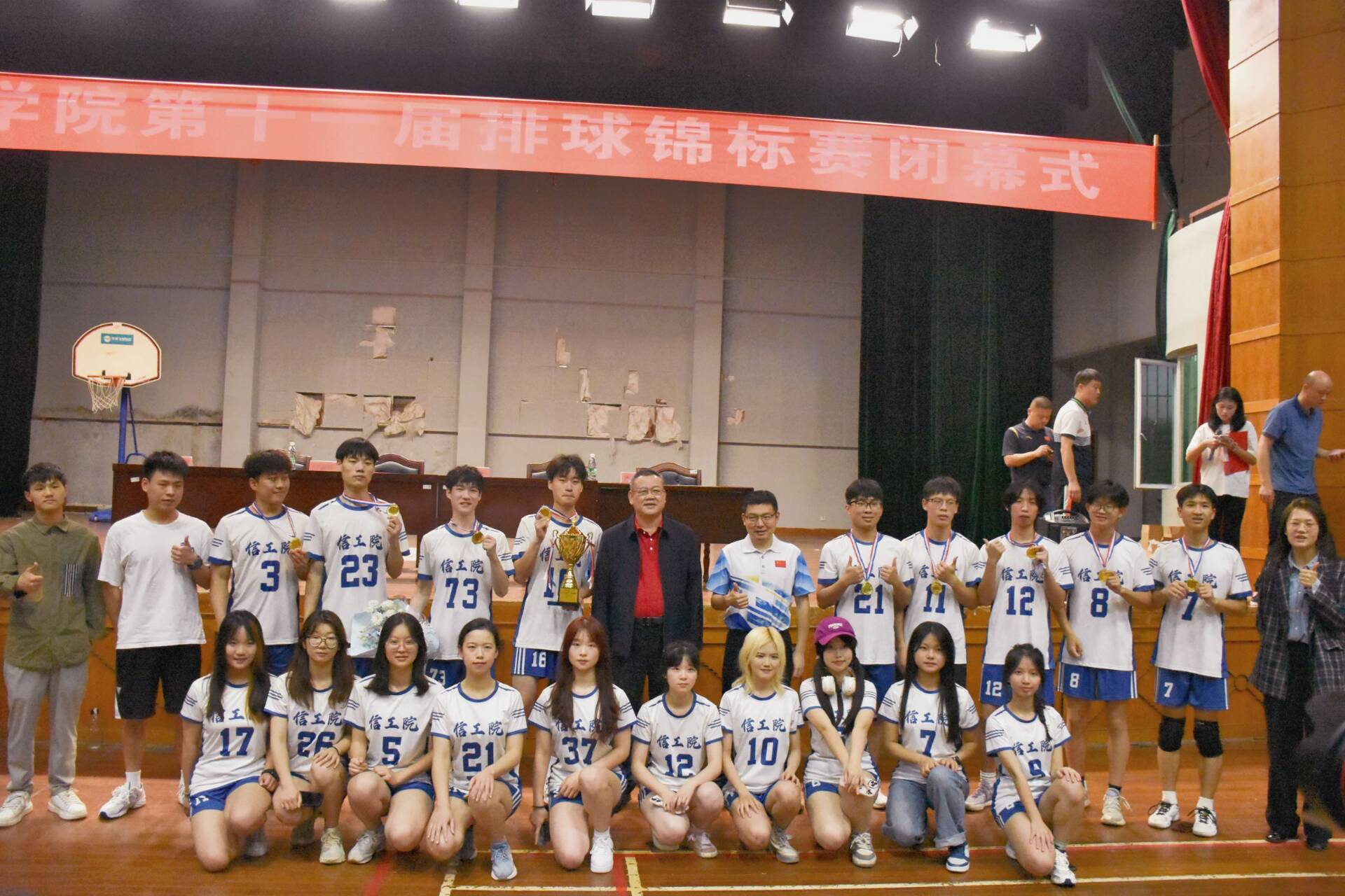 本网讯(通讯员 张展鹏 向慧蓉)4月25日,我校第十一届排球锦标赛在体育馆圆满落幕。经过激烈地角逐,我院排球队员经过顽强的拼搏,凭借出色的团队配合,成功夺得冠军。