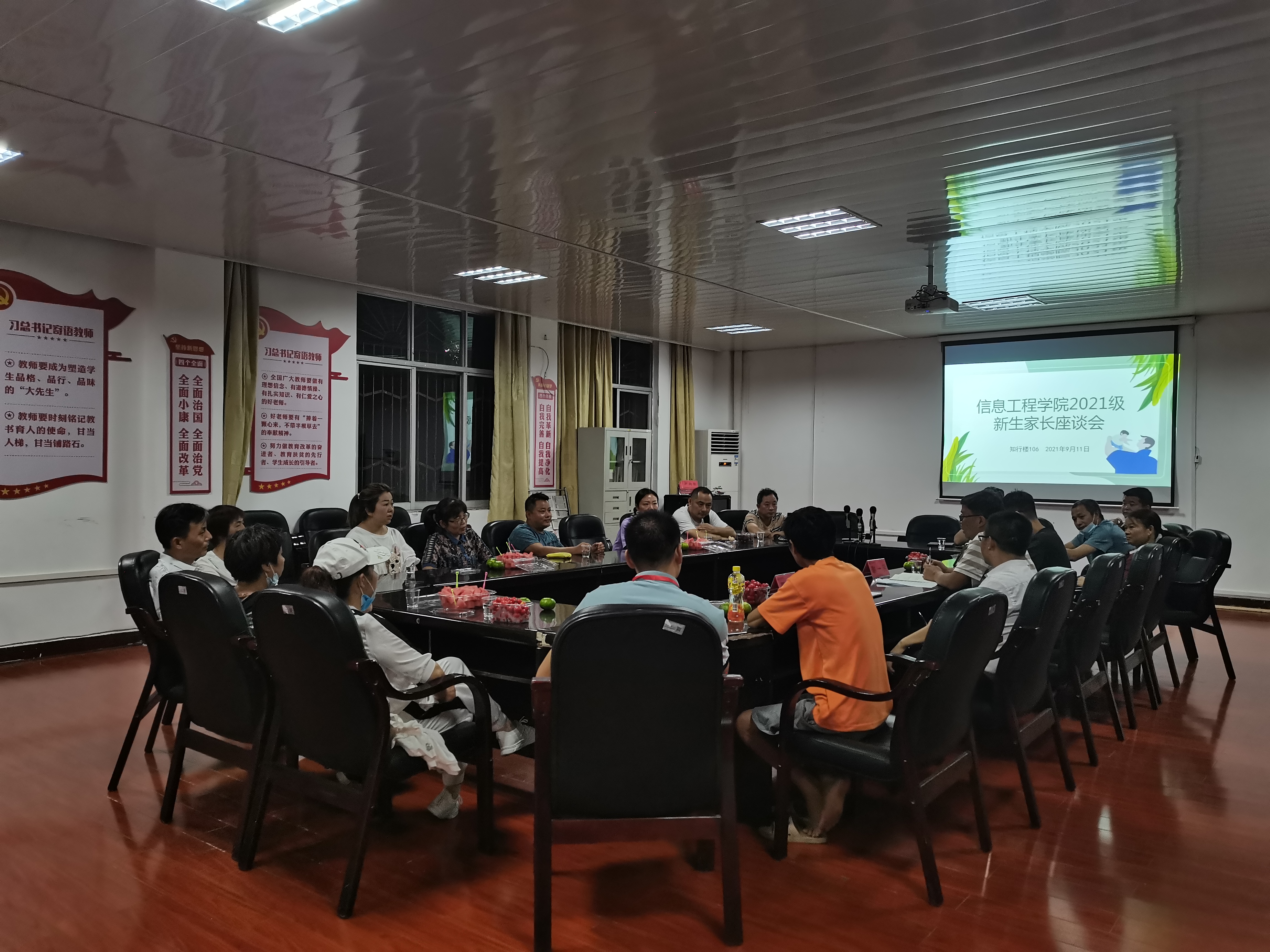 本网讯(通讯员 孙艳香 李姗姗) 9月11日晚,学院召开2021级新生家长座谈会。院党总支书记谢一民,总支副书记夏汉伟,2021级新生辅导员和部分班主任,以及来自各班的17名新生家长代表参加座谈会。