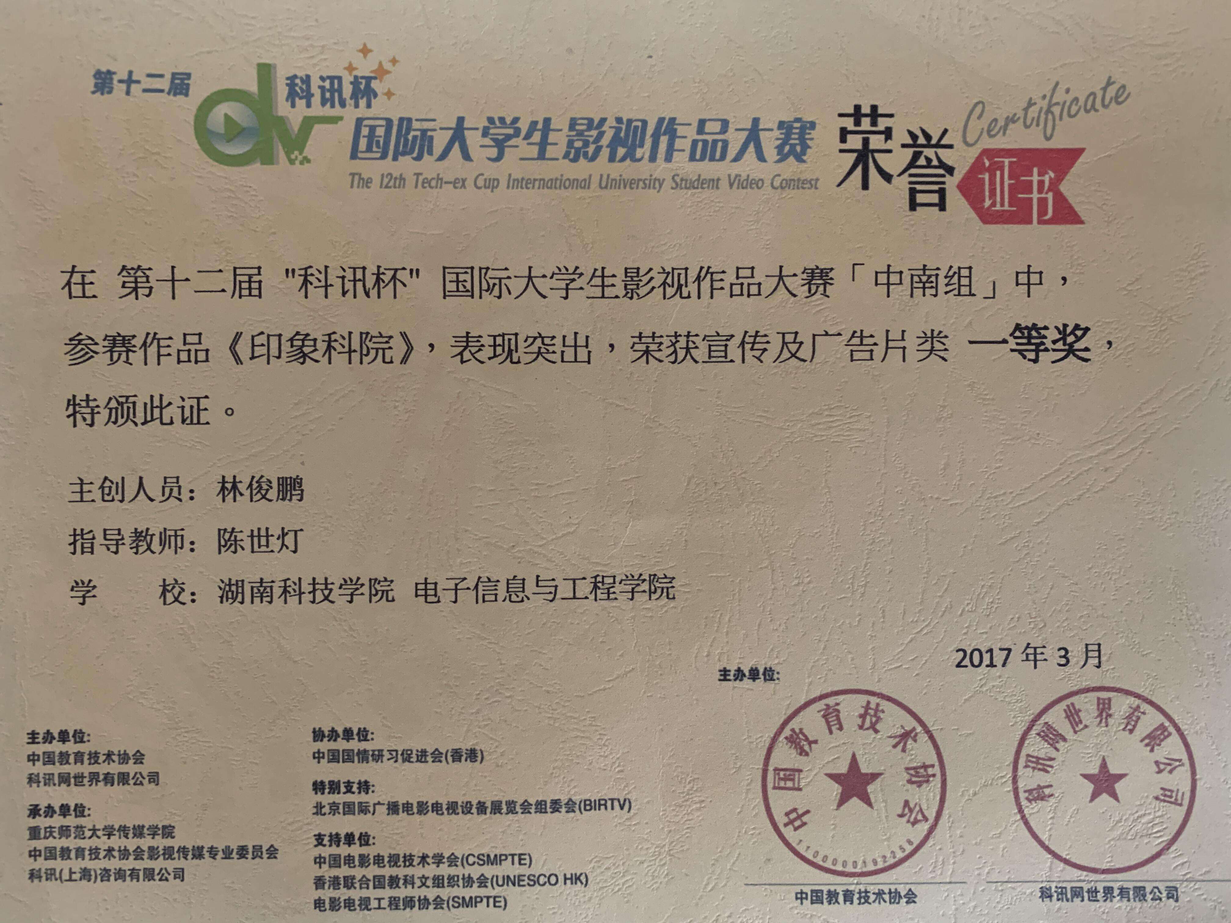 学科竞赛:第12届“科讯杯”国际大学生影视作品大赛 一等奖
