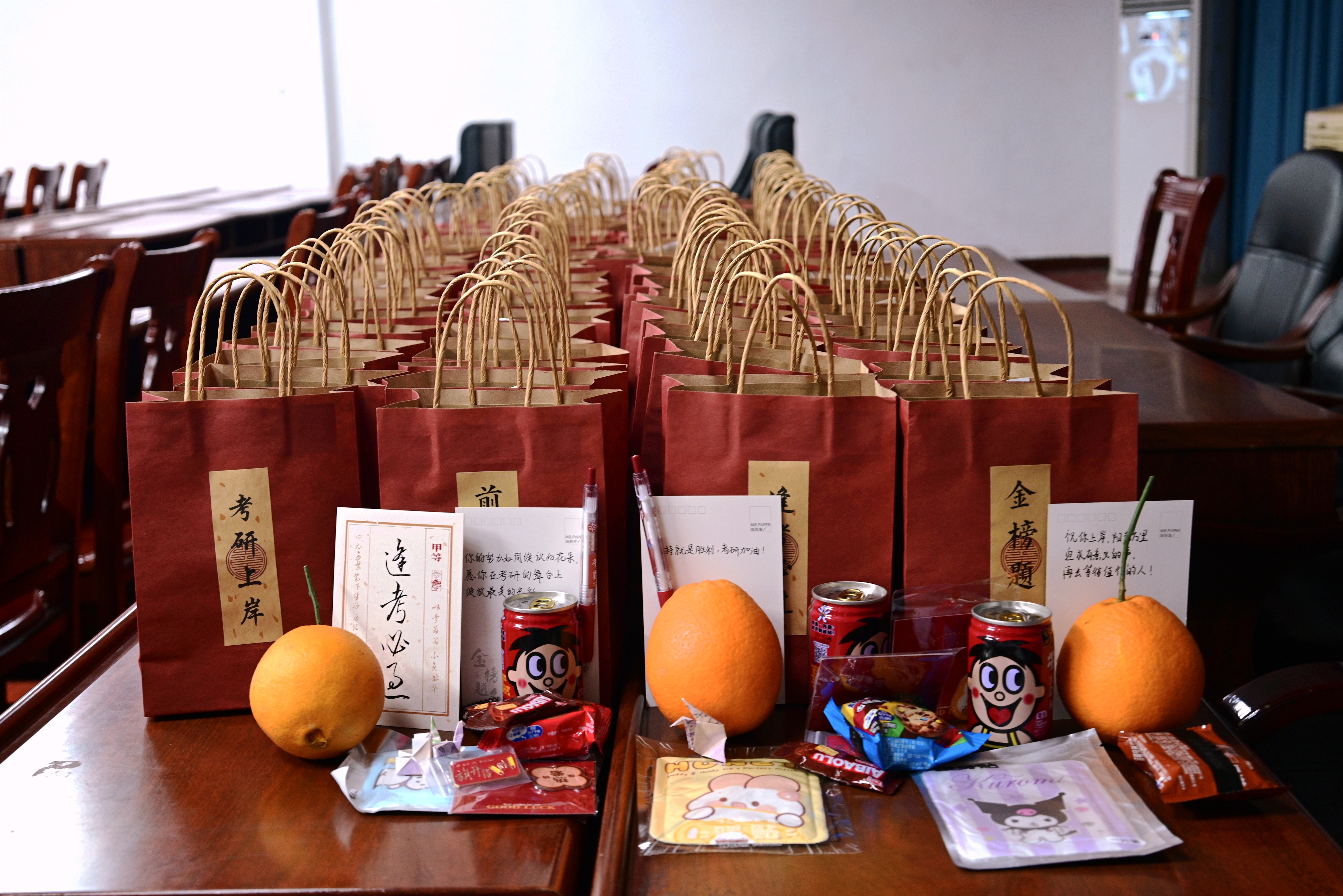 随后,院领导为考研学子们发放精心准备的加油助力大礼包,其中的10件物品处处体现着“用心”和“暖心”,金榜题名的手提袋中诚意满满,好运多多:老师、同学们手写的祝福卡片和千纸鹤,寓意一战“橙”硕维C多多的橙子,寓意“巧克”难题能量满满的巧克力,寓意“考场上最旺的仔”的旺仔牛仔,“一战成硕”钥匙扣以及暖贴和书签等。