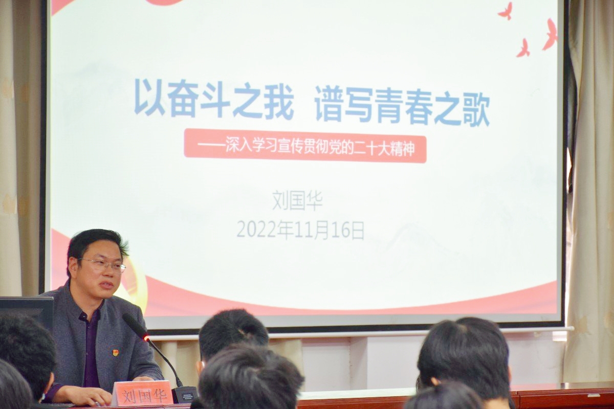 本网讯(通讯员 向慧蓉) 为深入学习宣传贯彻党的二十大精神,11月16日,院党总支书记刘国华以《以奋斗之我,谱写青春之歌》为题,为学生党员和学生干部上党课,140余名学生参加党课培训。