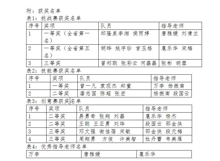 本网讯(通讯员 郭靖 刘兵兵)3月19日,第六届湖南省大学生物联网应用创新设计竞赛决赛在长沙师范学院落下帷幕,经过激烈角逐,我院学子凭借雄厚的实力从134支参赛队伍中脱颖而出,再创佳绩,共获得挑战赛、技能赛、创意赛等项目的一等奖3项、二等奖3项、三等奖3项,其中挑战赛3队邱隆泉、李湘、侯雨婷同学以总分96.17的电脑自动判分蝉联全省冠军,唐雅媛、万李、扈乐华获省优秀指导老师,学校获团体总分第二名,并获优秀组织奖。
