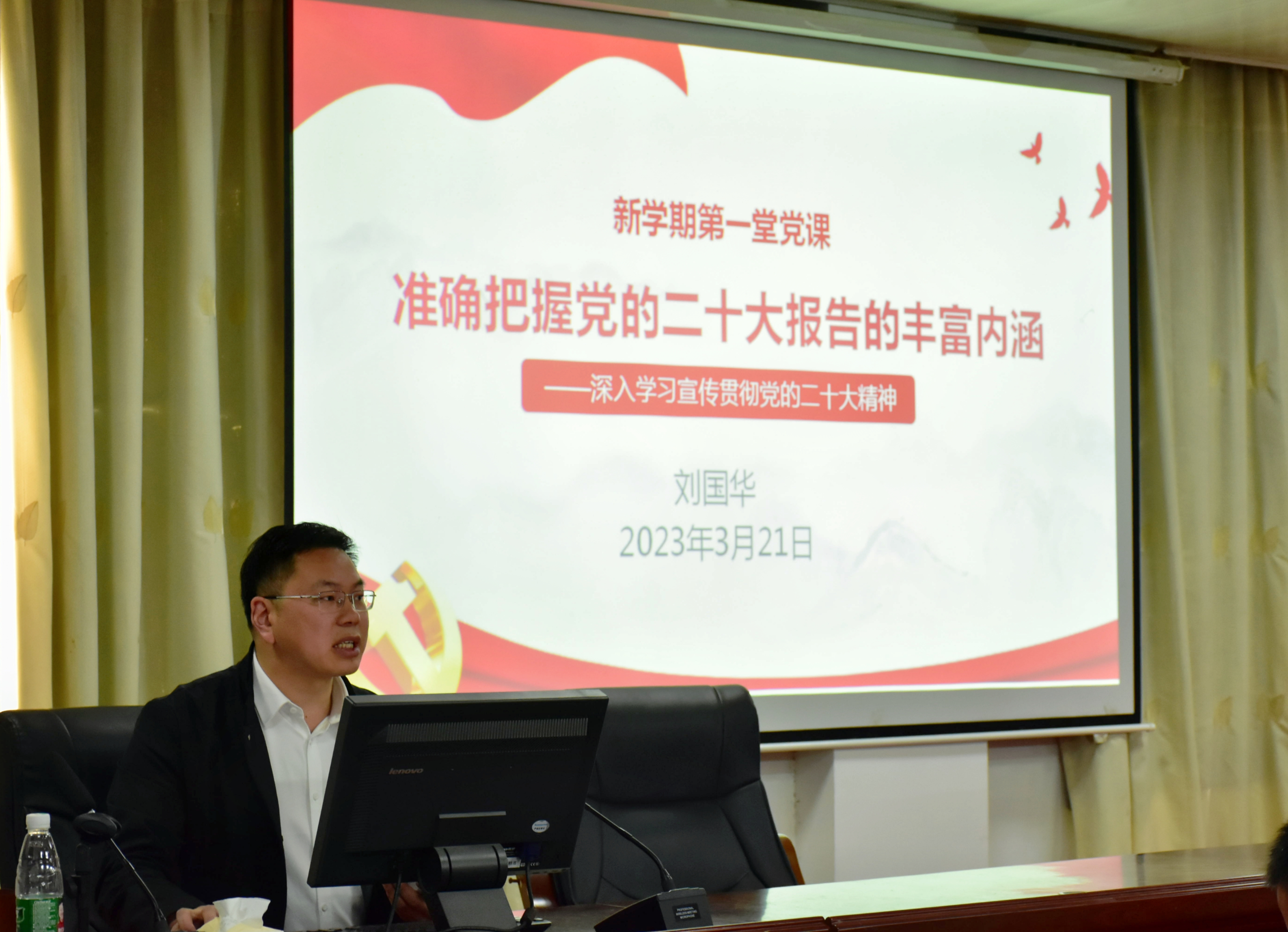 本网讯(通讯员 李双 刘兵兵)为进一步营造贯彻落实党的二十大精神的浓厚氛围,根据省委教育工委和学校党委通知要求,3月21日,学院党总支书记刘国华以“准确把握党的二十大报告的丰富内涵”为题,为学院全体党员讲授“新学期第一堂党课”。