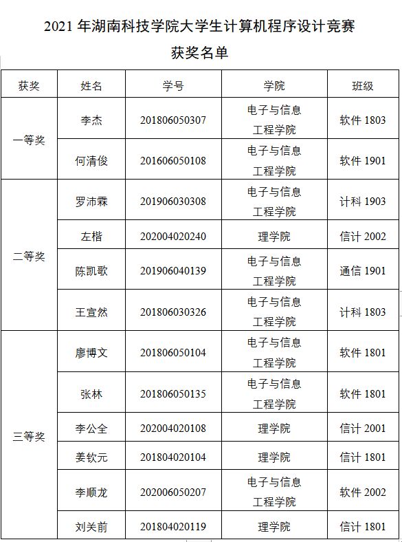 根据《关于举办2021年九游在线大学生计算机程序设计竞赛的通知》的要求,2021年九游在线大学生计算机程序设计竞赛于2021年3月23日下午14:30-18:00在知行楼305、306机房举行,获奖队员自动入围ACM程序设计大赛集训队。现将竞赛结果予以公示,公示期为3天,自2021年3月26日起至3月28日止。公示期间,如有异议,请以书面形式实名向纪委或教务处实践教学科反映。
