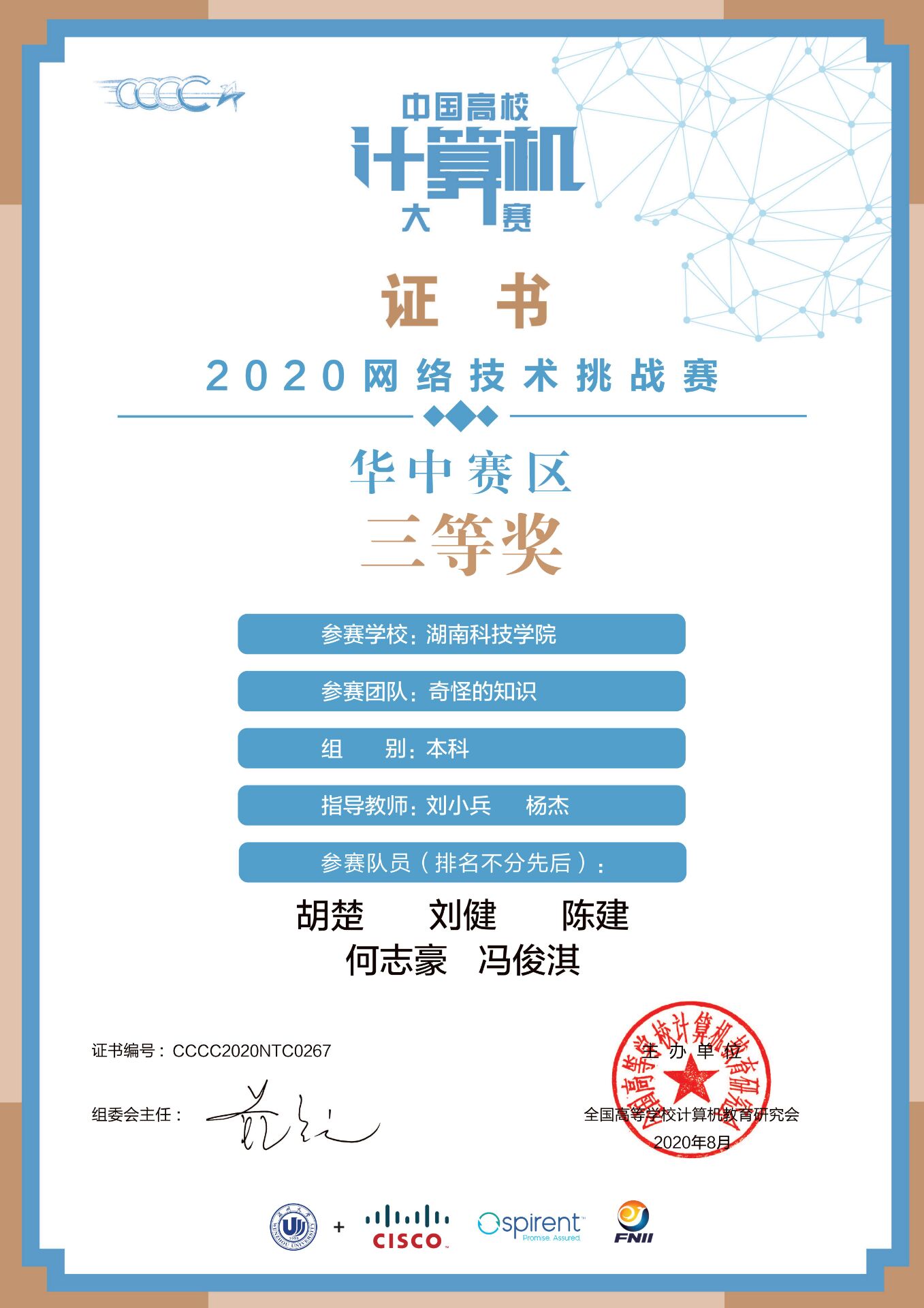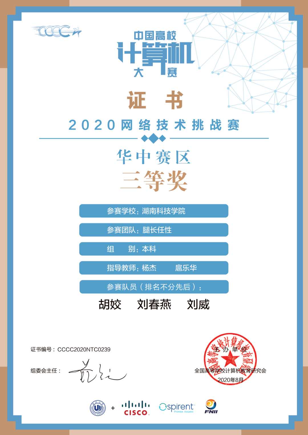 中国高校计算机大赛2020网络技术挑战赛在8月落下帷幕,由电子与信息工程学院杨杰、刘小兵、扈乐华、黄堂森、韦美艳老师带队团队分别荣获本科组三等奖三项。