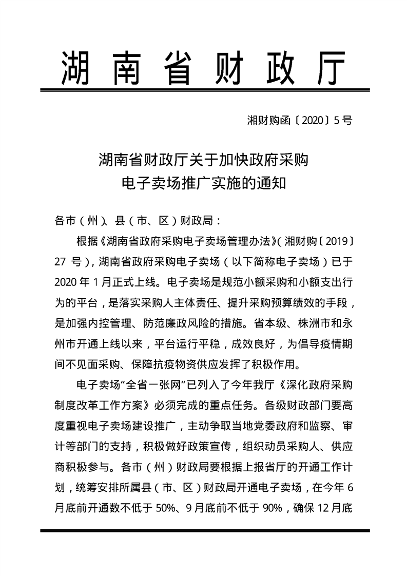 转发:湖南省财政厅关于加快政府采购电子卖场推广实施的通知