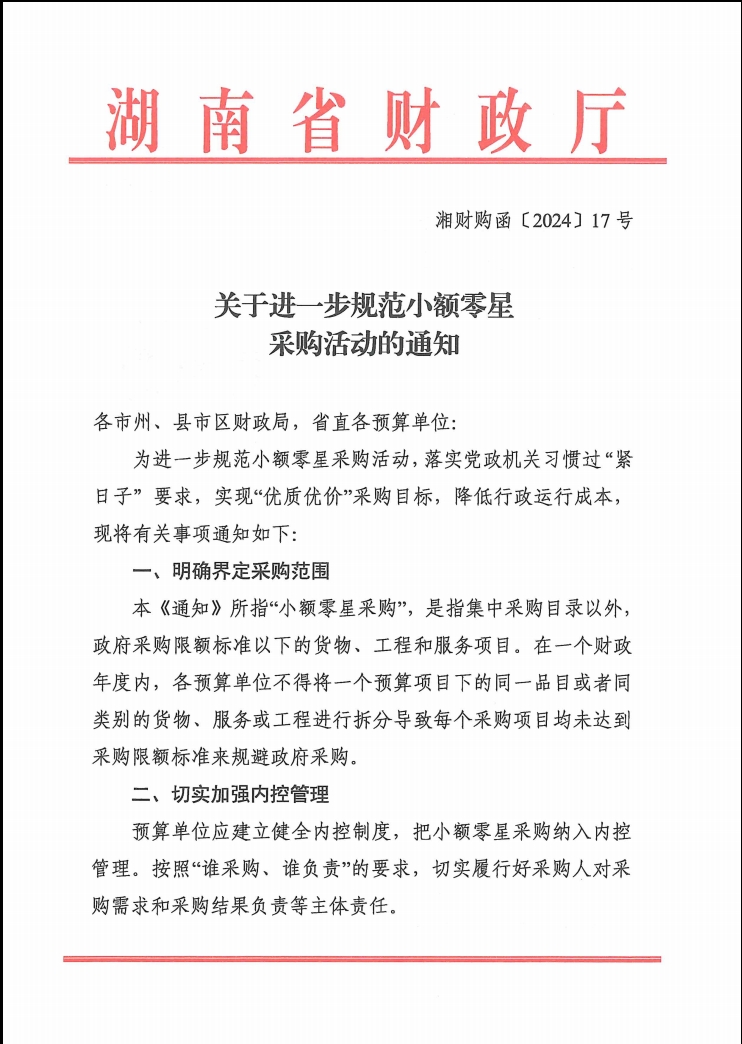 转发《湖南省财政厅关于进一步规范小额零星采购活动的通知》