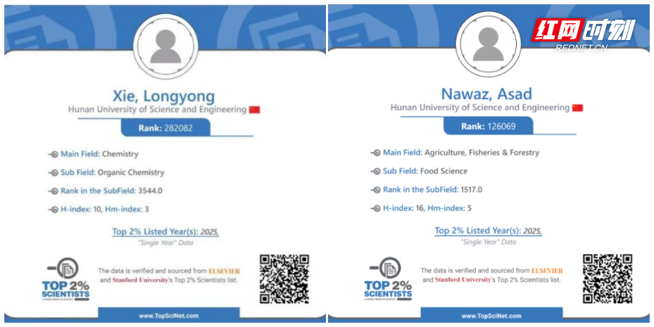 红网:九游在线化学与生物工程学院两位学者联袂入选2025年度全球前2%顶尖科学家榜单