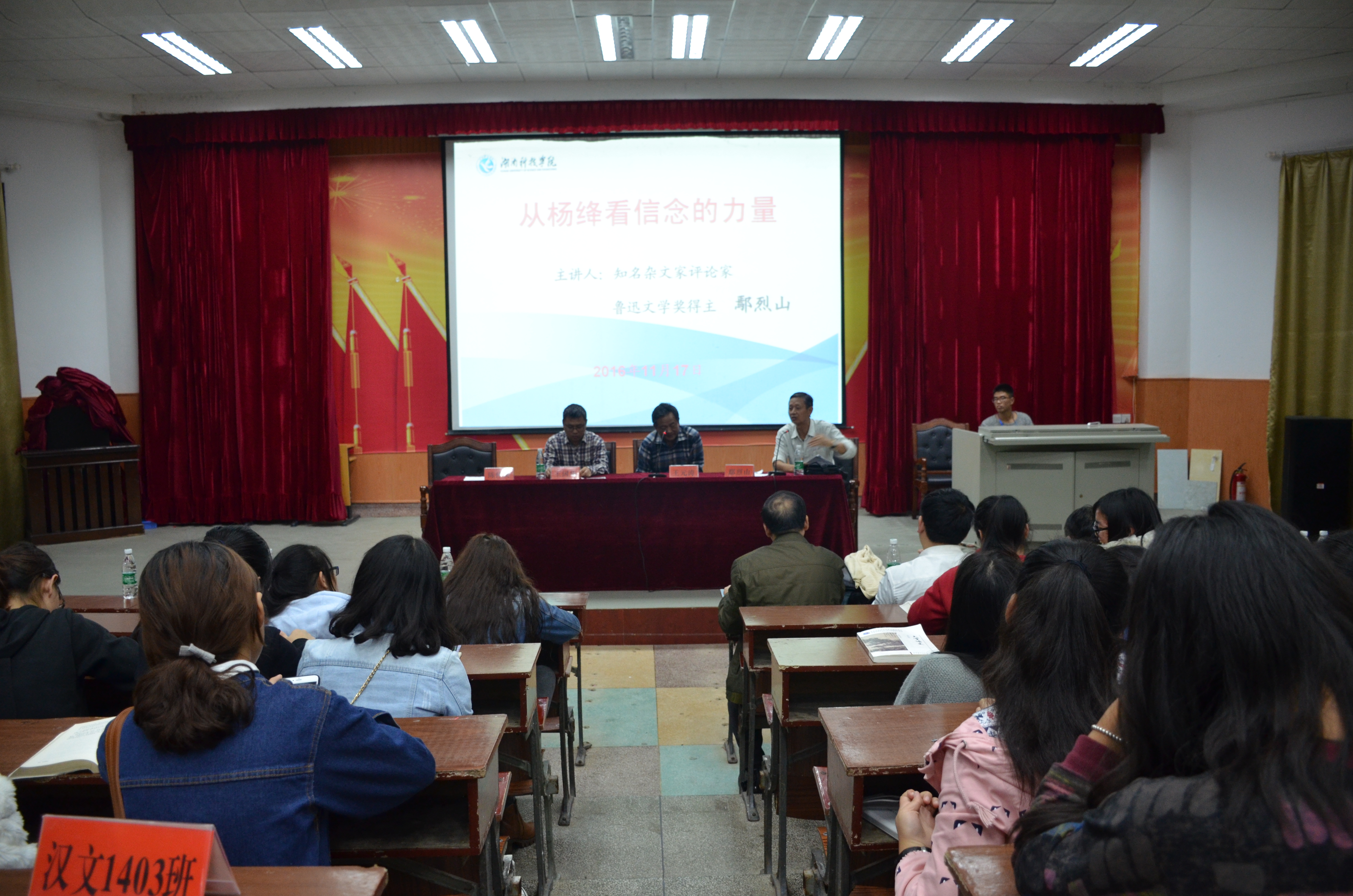 本网讯 11月17日下午,知名杂文家、时评家,原《南方周末》总编助理,鲁迅文学奖获得者鄢烈山应邀来校讲学。鄢烈山为我校师生作了题为“从杨绛看信念的力量”的讲座。深圳《时代商家》杂志执行总编辑王元涛,深圳市杂文学会副会长、专栏作家王国华,当代作家、批评家、湖南师范大学新闻学院副教授、我校中文系91级校友魏剑美,副校级督导、工会主席陈仲庚等出席。
