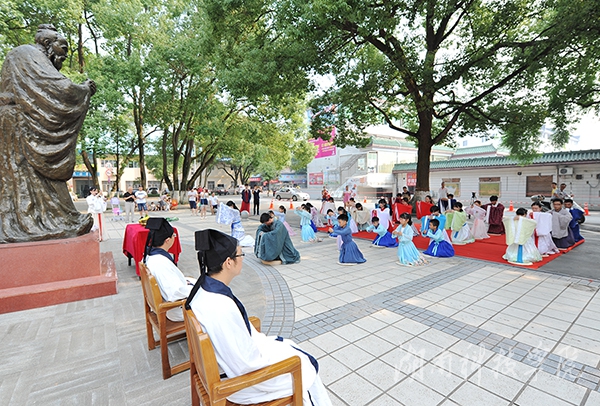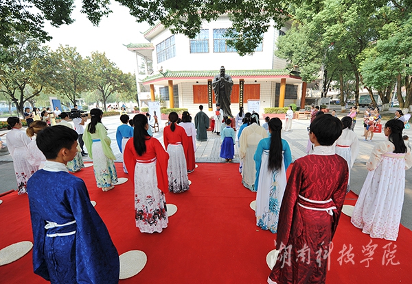 本网讯 (摄影 何帅文)今年是我国大成至圣先师孔子诞辰2567周年。孔子诞辰纪念日的前一天,9月27日上午,校园内孔子雕像前雅乐悠扬,气氛典雅庄重。为纪念古圣先贤,弘扬中华优秀传统文化和尊师重教的优良传统,20余名学子身着华丽汉服,在孔子雕像前隆重行拜师礼,让现场师生享受了一场传统文化盛宴。