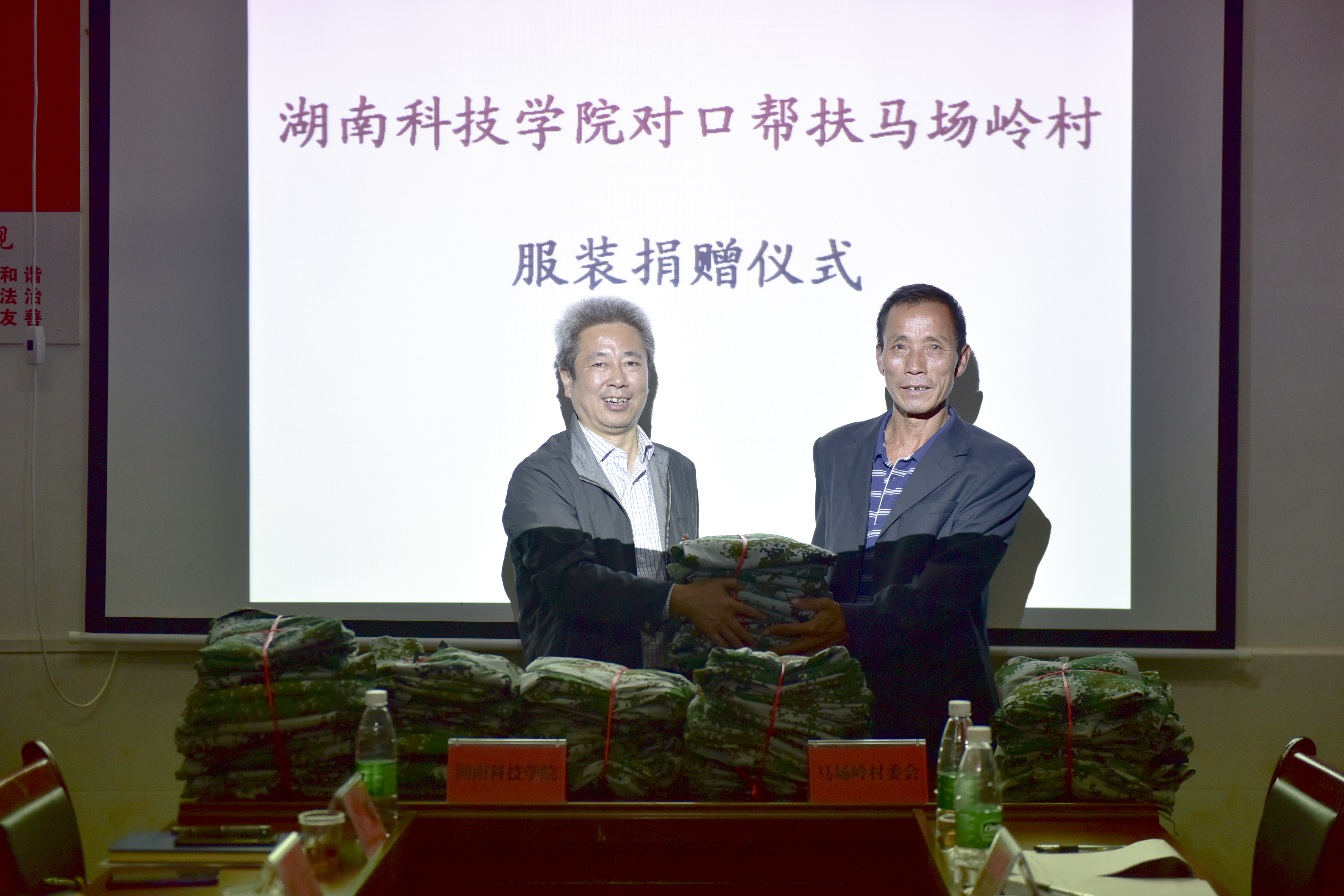 现场还开展了军训服装义捐活动。曾宝成代表学校向马场岭村捐赠军训服装。据了解,此次共捐献迷彩服1500余件,体能服600余件,帽子1000余顶,鞋子700余双。