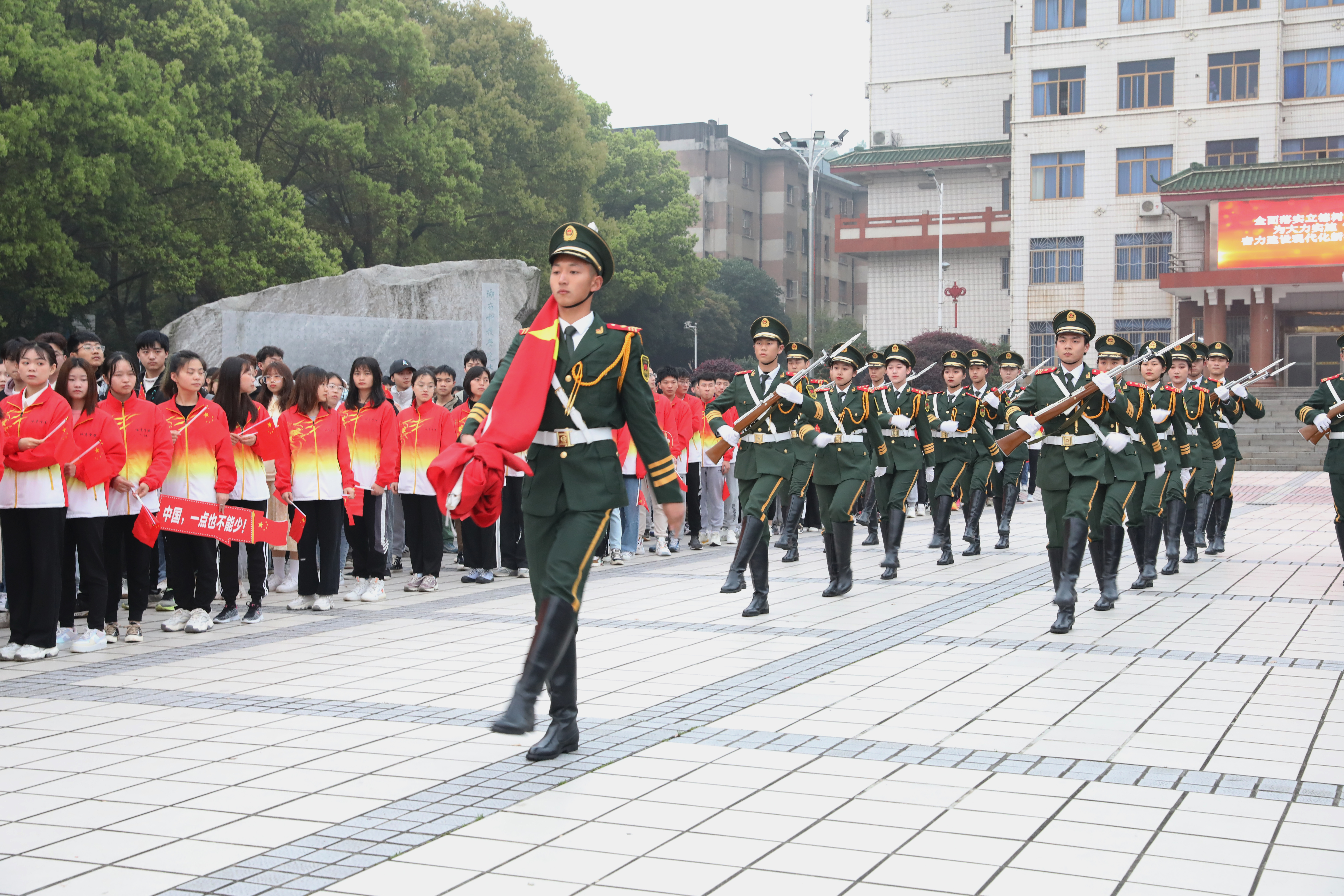 早上七时许,国旗方队迈着整齐划一、铿锵有力的步伐走向升旗台。在庄严的国歌声中,鲜艳的五星红旗冉冉升起,在晨光中熠熠生辉。全体在场师生列队肃立,向国旗行注目礼。