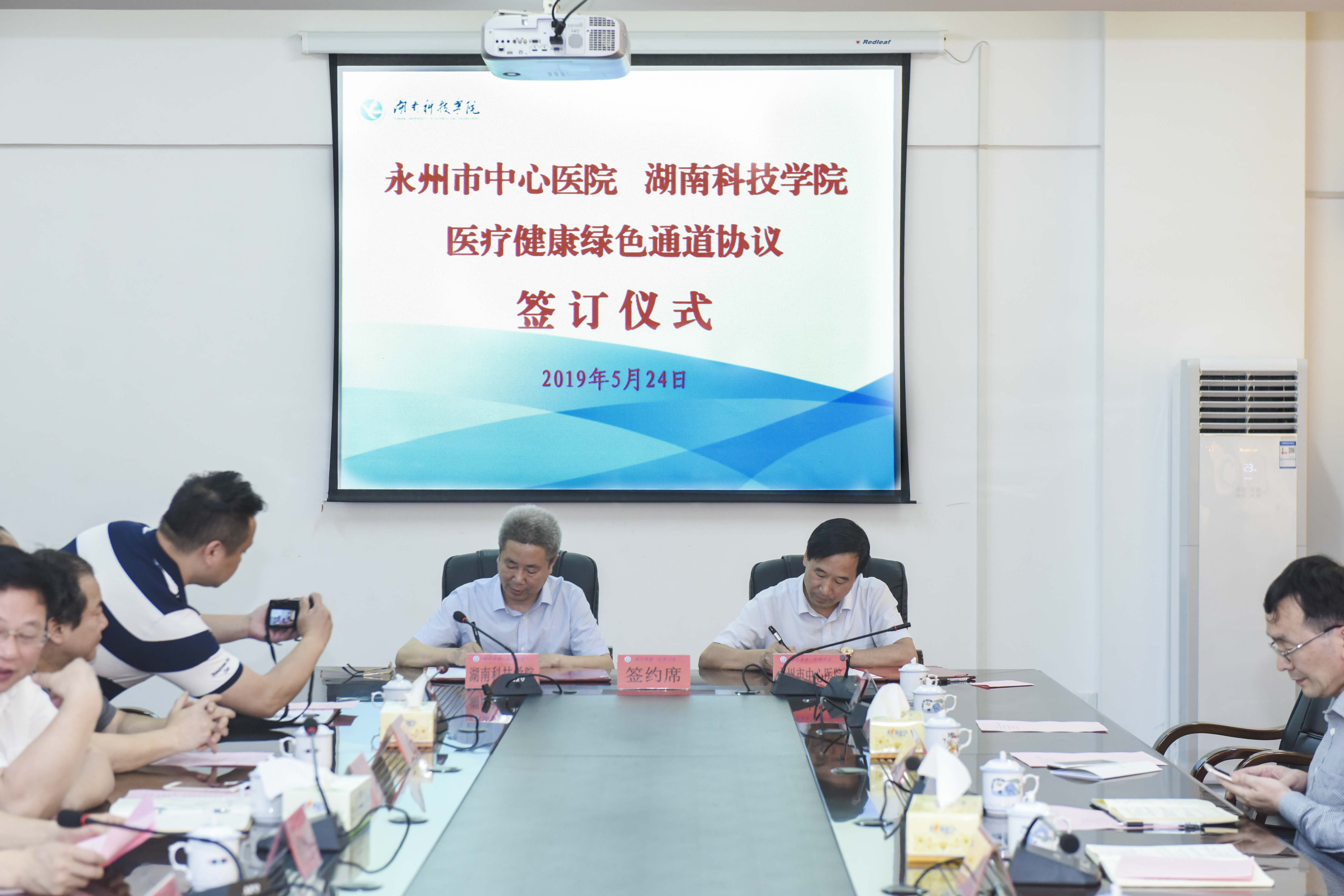 本网讯  5月24日上午,我校与永州市中心医院共建医疗健康绿色通道并举行协议签约仪式。永州市中心医院院长刘彬、党委书记赵承保,校党委书记、校长曾宝成,党委副书记、工会主席唐艳明,副校长吴小林出席,仪式由吴小林主持。