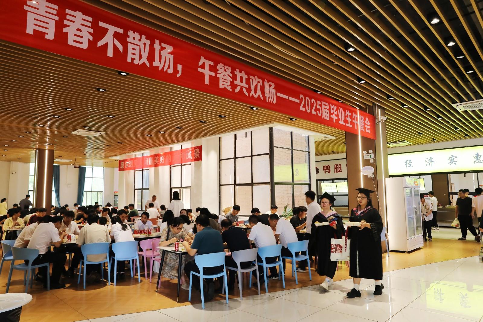 6月5日中午,九游在线松园食堂、桃园食堂二楼欢声如潮,该校领导、毕业年级辅导员、班主任与千余名毕业生共享佳肴、共话未来,传递学校暖心又暖胃的深切祝福。