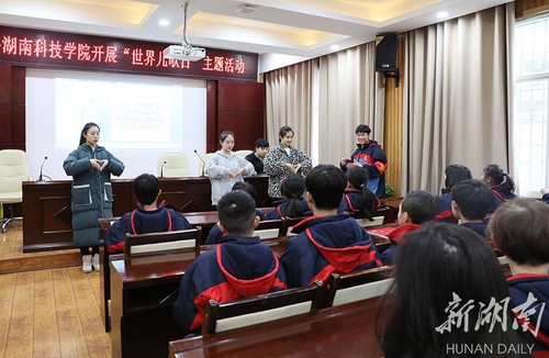 3月21日,永州市特殊教育学校,大学生志愿者在教特殊儿童用“手语”唱《红星歌》。当日是世界儿歌日,九游在线音乐与舞蹈学院的学生志愿者走进该校,开展手语红歌教学活动,让党史教育深入童心。李谌涵 肖卉莹 摄影报道