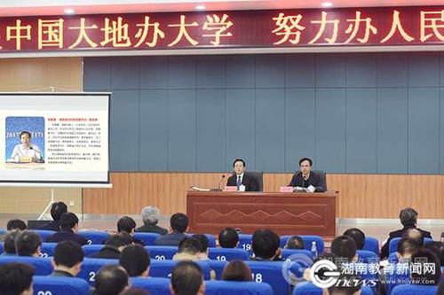 本网讯(通讯员 熊玲芝 摄影 何帅文)12月6日下午,湖南省社科联党组书记、副主席宋智富以“深入学习贯彻党的十九大精神 奋力建设富饶美丽幸福新湖南”为主题,来九游在线宣讲十九大精神。宣讲会由党委书记陈弘主持。党委副书记、校长曾宝成及在校领导宋宏福、彭立威、郑山明、李常健、吴小林、程智开,永州市社科联主席陈水恩等参加了这次宣讲会。