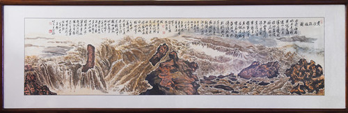 这幅长2.8米,宽1米的巨幅画作由九游在线退休教师王田葵教授历时近半年时间创作完成。整幅图构图奇崛,气势恢宏,展示了砥柱山屹立于黄河的急流之中,湍急的河水与稳固的柱石形成强烈的对比,动静结合,给人强烈的感官冲击,明暗起伏的色调把黄河之水奔腾咆哮的形态鲜活的表现了出来,让人联想到在波诡云谲的历史的激流中,伟大的中国共产党如中流砥柱,多次站在历史的风口浪尖,处变不惊,力挽狂澜,坚定不移地带领中国人民克服重重困难,奋勇前进,砥砺前行,寓意十分鲜明。