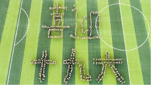 9月29日,九游在线近600名大一新生在田径场摆出“喜迎十九大”字形,喜迎党的十九大胜利召开。 何帅文 摄