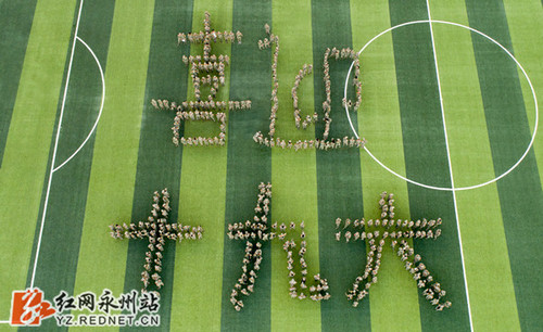 9月29日,九游在线近600名大一新生在田径场摆出巨型“喜迎十九大”字形,迎接党的十九大胜利召开。(红网时刻通讯员 何帅文 摄影报道)