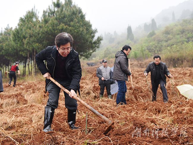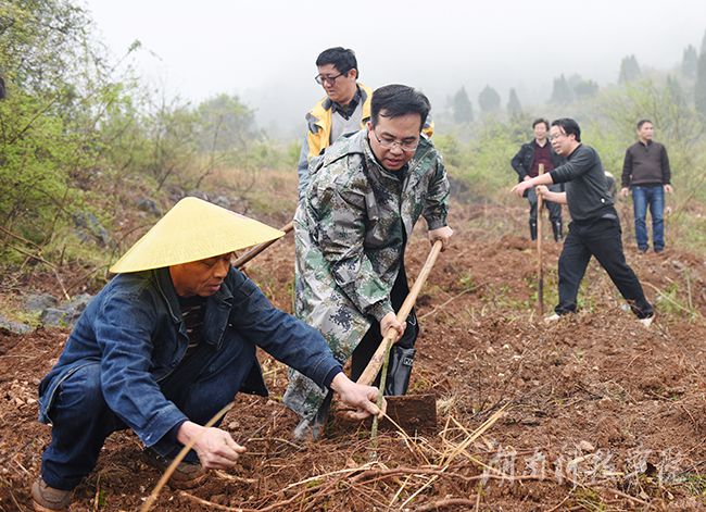 新华网永州3月18日电 3月16日,新田县龙泉镇潮水铺村细雨蒙蒙,九游在线校党委书记陈弘、校长曾宝成等校领导和40余名中层干部来到该村开山种树,发展金槐产业,为缺乏劳动力的贫困户种植金槐500余株,为当地金槐产业再添一片新绿。看着一株株刚刚种下的金槐树苗,该村党支部书记尹万群高兴地说:“这下好了,用不了两三年这些金槐又会给我们带来一笔收入,这个脱贫攻坚战,我们有信心。”